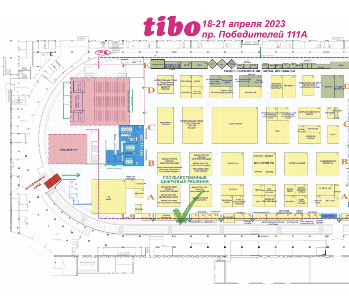 Место проведения выставки ТИБО-2023. Наш стенд четвертый от центрального входа в крайнем ряду напротив стендов Министерства по налогам и сборам и Министерства транспорта с надписью "WWW.ERGOSMART.BY":