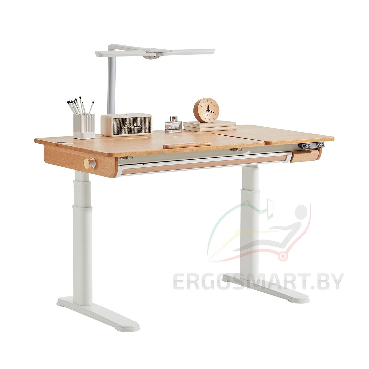 Представляем вам новую, уникальную коллекцию детской мебели Ergosmart. Мы написали детской мебели, но особенность ее в том, что благодаря сдержанному классическому дизайну, функциональным размерам и диапазонам регулировок все столы (парты) можно использовать всю жизнь, поэтому это столы и для взрослых. Мебель изготовлена исключительно из натуральных материалов: бук, гевея, а модель Caravel из ламинированной мебельной фанеры. Столы укомплектованы направляющими Hafele (Германия), в механизмах наклона столешниц установлены газовые пружины Suspa (Германия), части опор отлиты из алюминия и покрыты порошковой краской Tiger (Австрия).