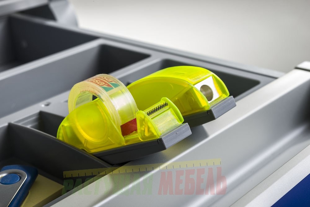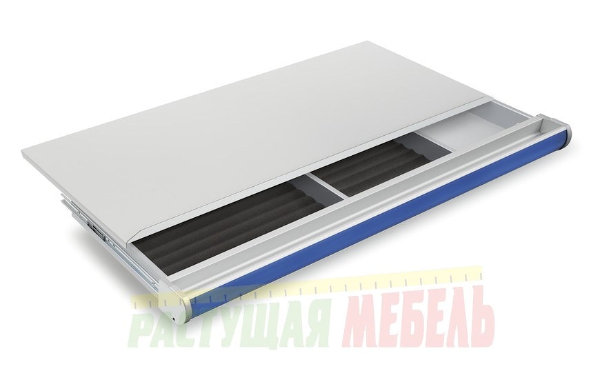 Ящик для детских школьных парт Winner и Winner Split разделен на 3 отделения разного размера. К каждому из них прилагается специальный вкладыш из плотного поролона, который препятствует скольжению мелких предметов внутри ящика.