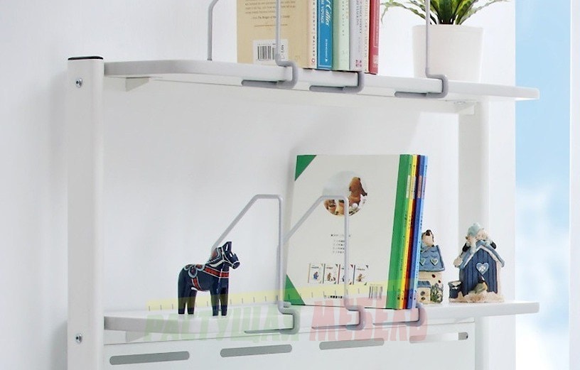 Два верхних этажа представляют собой полки со сдвижными держателями для книг. Расстояние между двумя полками достаточное для размещения высоких папок для деловых записей, альбомов, журналов, учебников и тетрадок разных размеров.