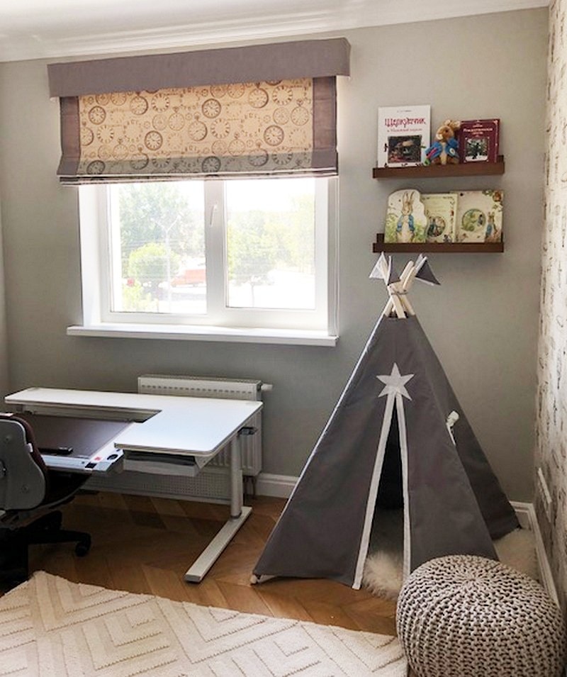 Площадь помещения составляет 15 м². Мебель для ребёнка выбирали достаточно долго и очень тщательно, дабы не ошибиться. Несмотря на высокую стоимость «растущей» мебели, выбор пал именно на неё за счёт функциональности, эргономичности и комфорта.