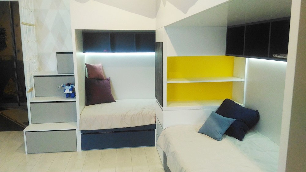 Я категорически была против двухъярусной кровати, поэтому комнату для детей сделали двухуровневой. Внизу - кровати, на втором этаже - игровая зона.