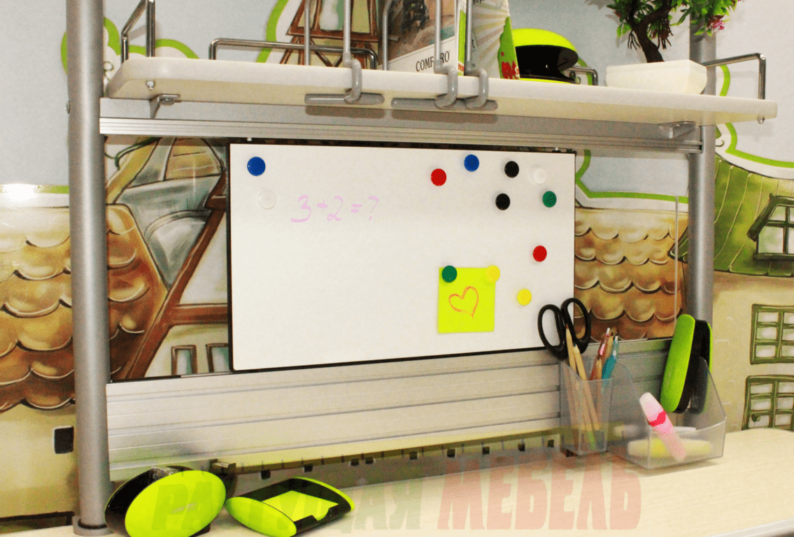Нижний уровень полки оснащен передвижной магнитной доской. На которой можно писать маркерами или разместить важную информацию. Также здесь присутствуют удобные передвижные контейнеры для канцелярских принадлежностей.