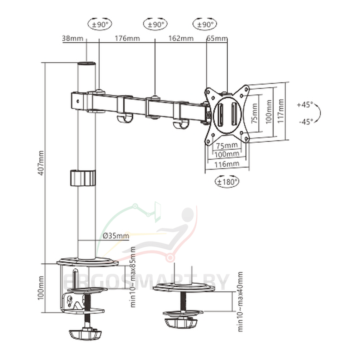 Вращение кронштейна | +90/-90 ° |