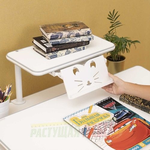 ![]() | Подставка для книг легко регулируется по углу наклона, а после окончания занятий ее можно сложить под полку, освобождая дополнительно место на столе. |