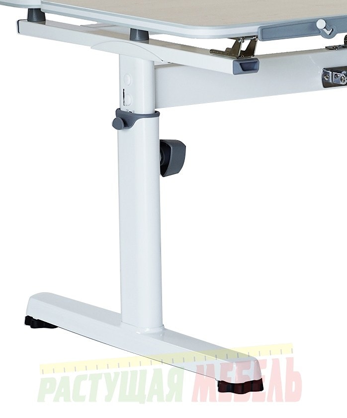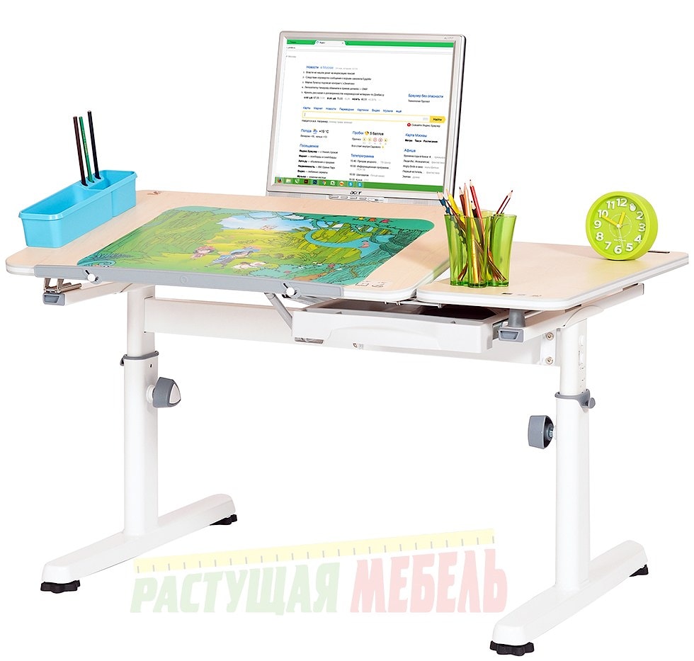 Столешница разделена на 2 части: стационарную в виде полки L-образной формы и наклонную, имеющую ступенчатую регулировку. Вариант цветовой гаммы столешницы только один-"клён", цвет каркаса - белый.