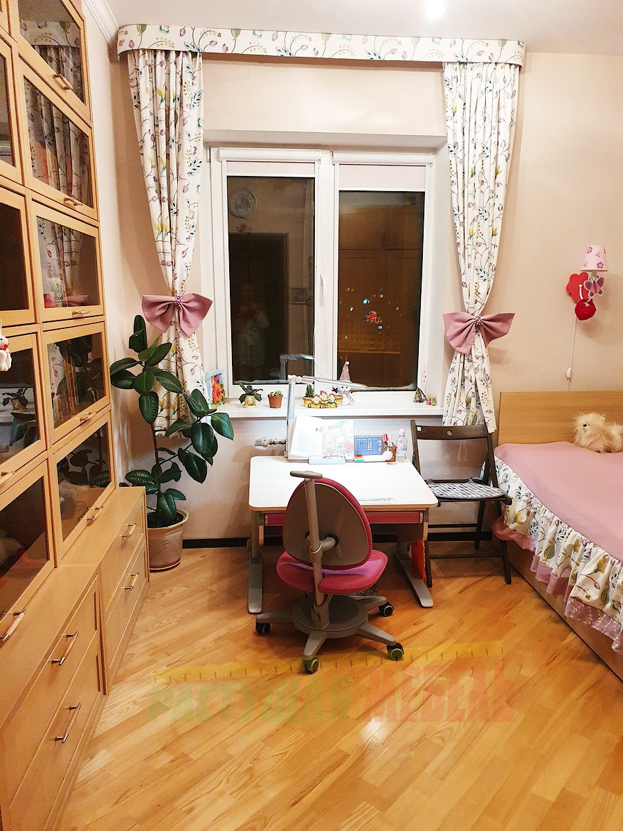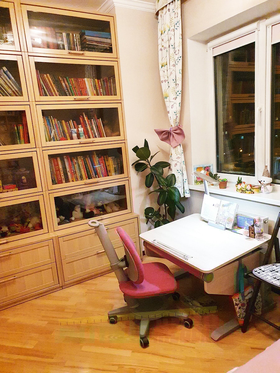 Комната у дочки небольшая, всего 10,4 м². На полу паркет и мебель в натуральных природных тонах. В детской уже заняли свои почетные места большая кровать, шкаф, стеллаж для нашей библиотеки. Вся мебель из натурального дуба. Поэтому при выборе парты хотелось максимально попасть в тон нашей основной мебели.