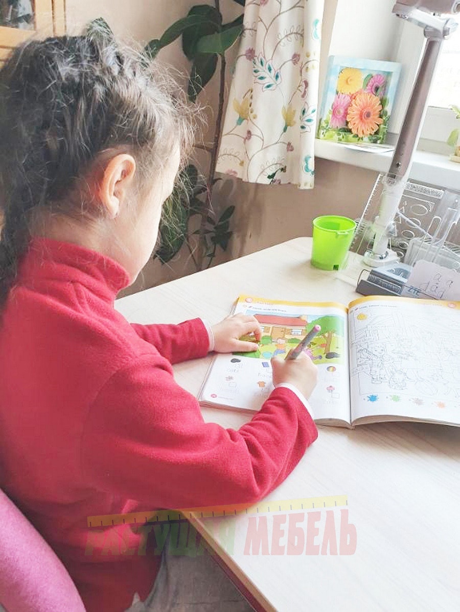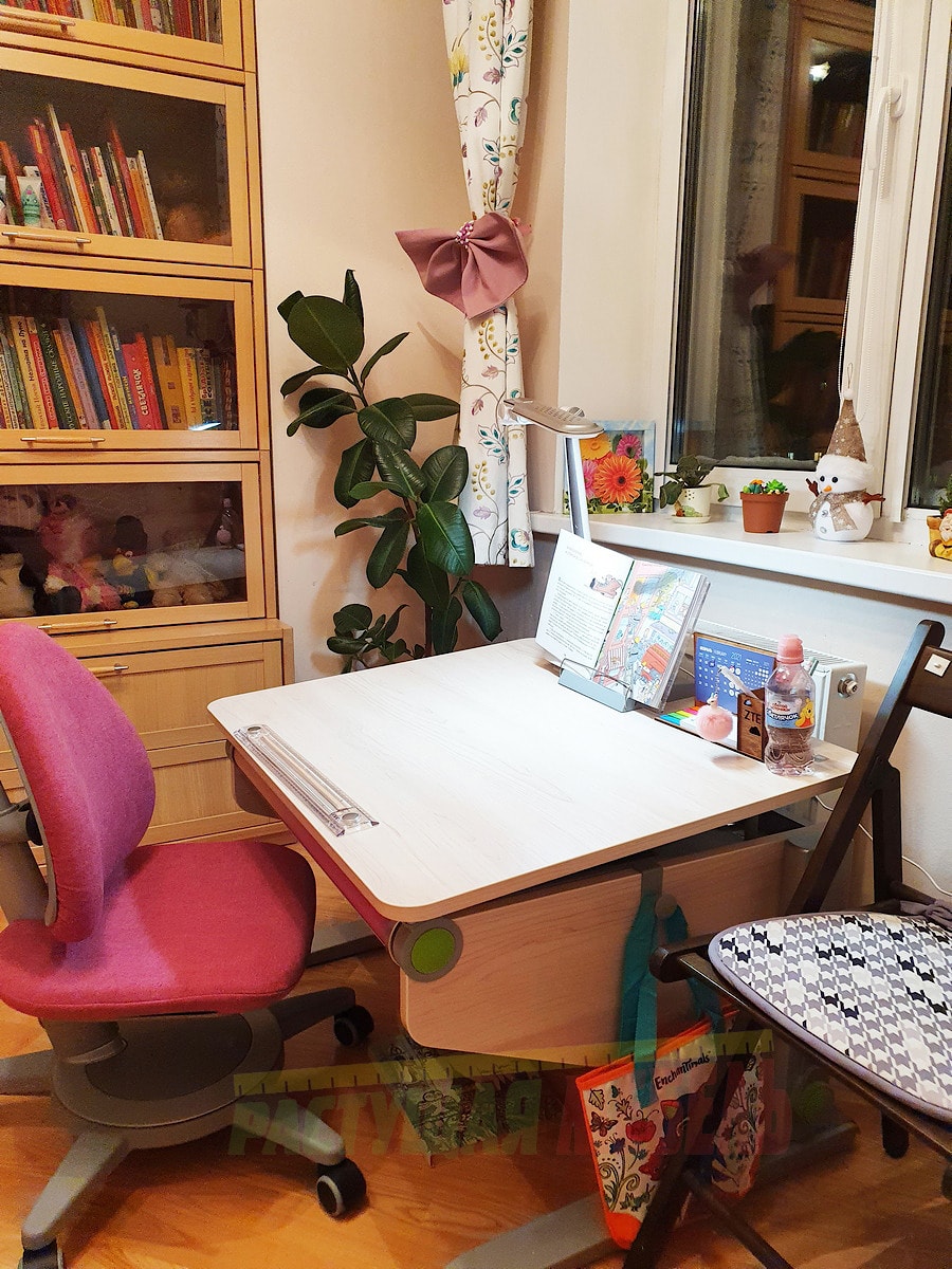 НО ЕСТЬ ОДНО НО: тон парты не совпал с нашей основной мебелью. Расцветка парты (новинка - белый клен) очень приятная для глаза, поэтому мы не стали на этом зацикливаться. Обыграем интерьерными решениями.