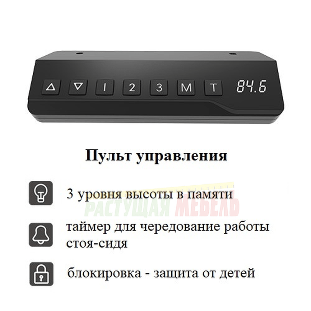 ![]() | Стрелки вверх-низ - для регулировки высоты; Цифры 1,2,3 - для запоминания положений; М - кнопка блокировки; Т - таймер. |