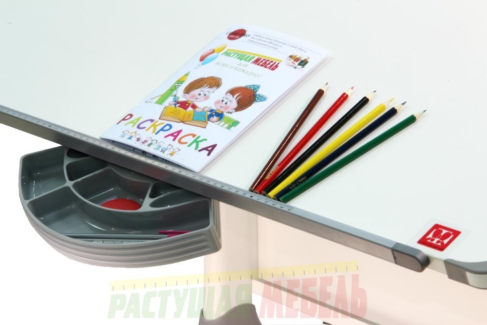 ![]() | Под столешницей расположен удобный, раскладывающийся веером, пенал для ручек, карандашей, стирок и точилки. |