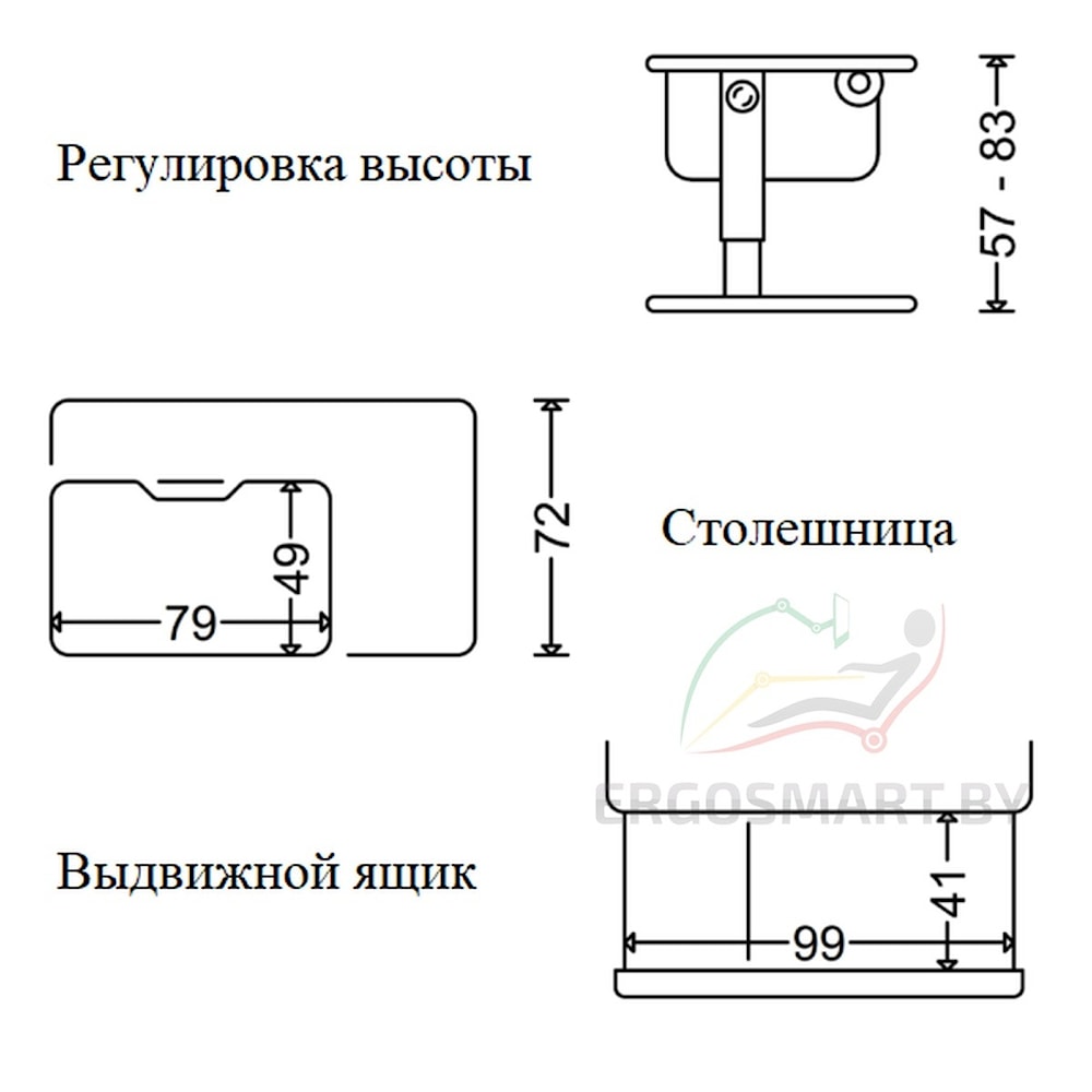 | Механизм регулировки высоты столешницы | бесступенчатая регулировка с помощью ручки от 57,5 до 82,5 см |