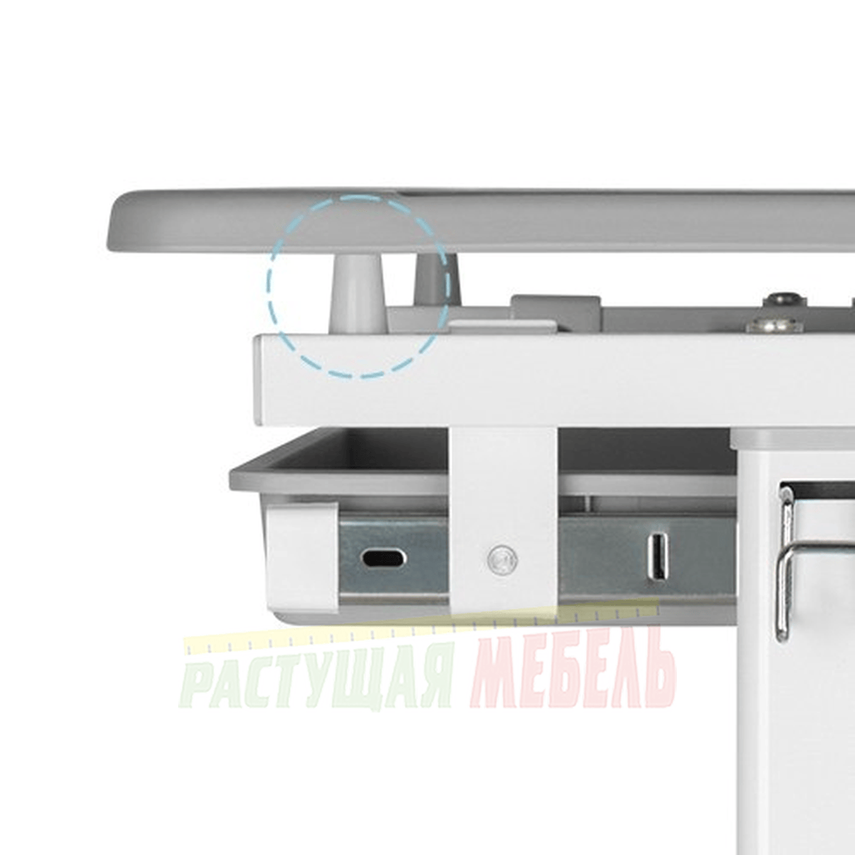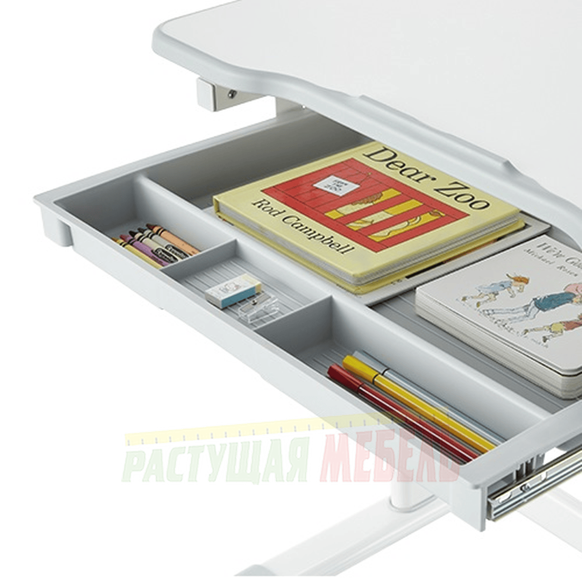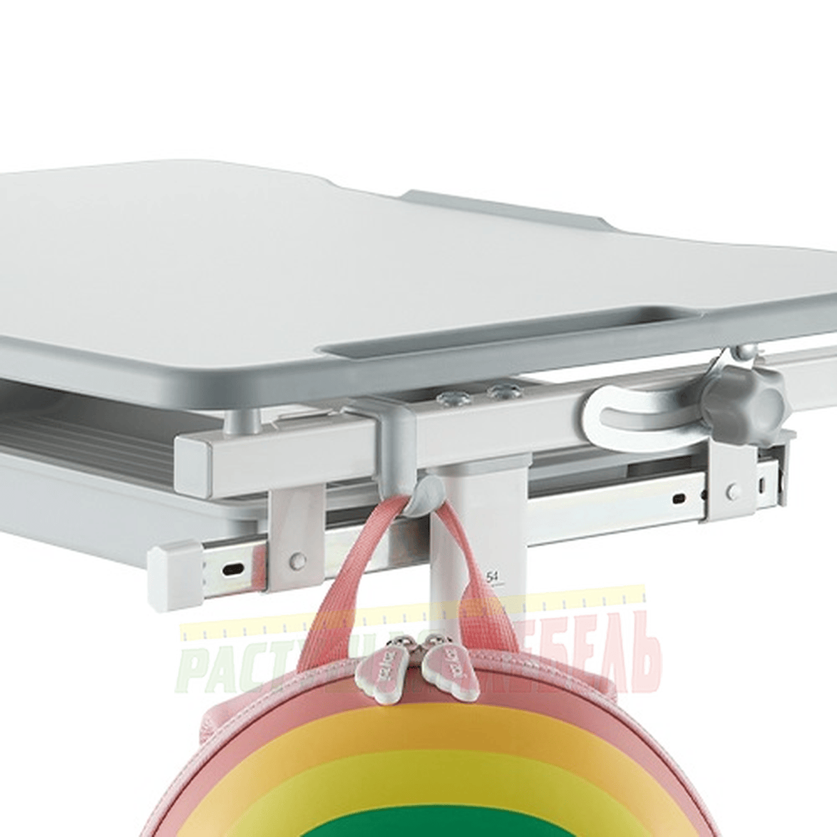 ![]() | Под партой размещен вместительный пенал с дополнительными делениями для канцелярских принадлежностей. У края столешницы расположен барьер против скольжения. |