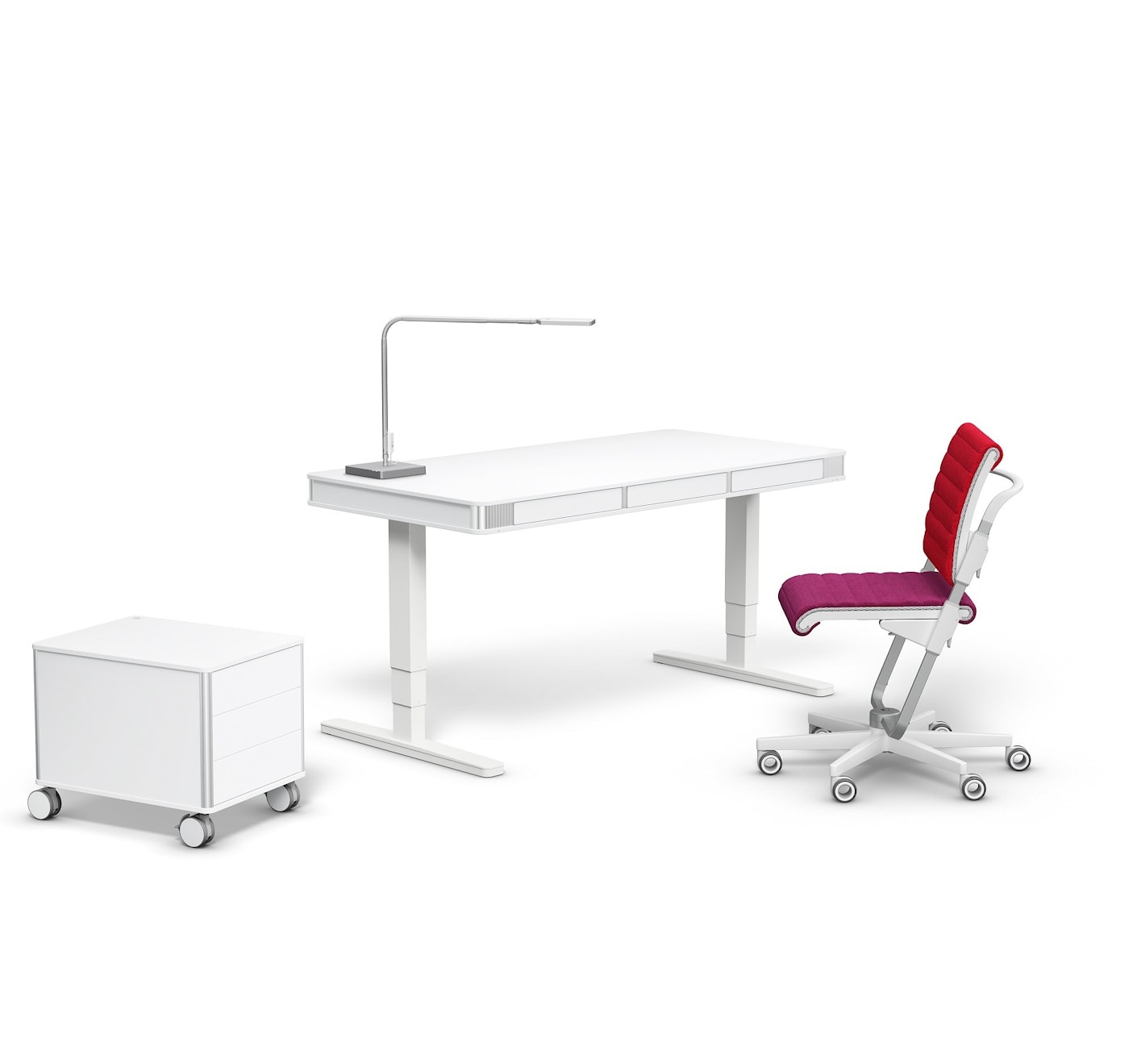 Дизайнерский регулируемый стол moll T6 L доступен в 2-х цветах корпуса, 5-ти цветах декора ящиков и 3-х отделках алюминиевого профиля: