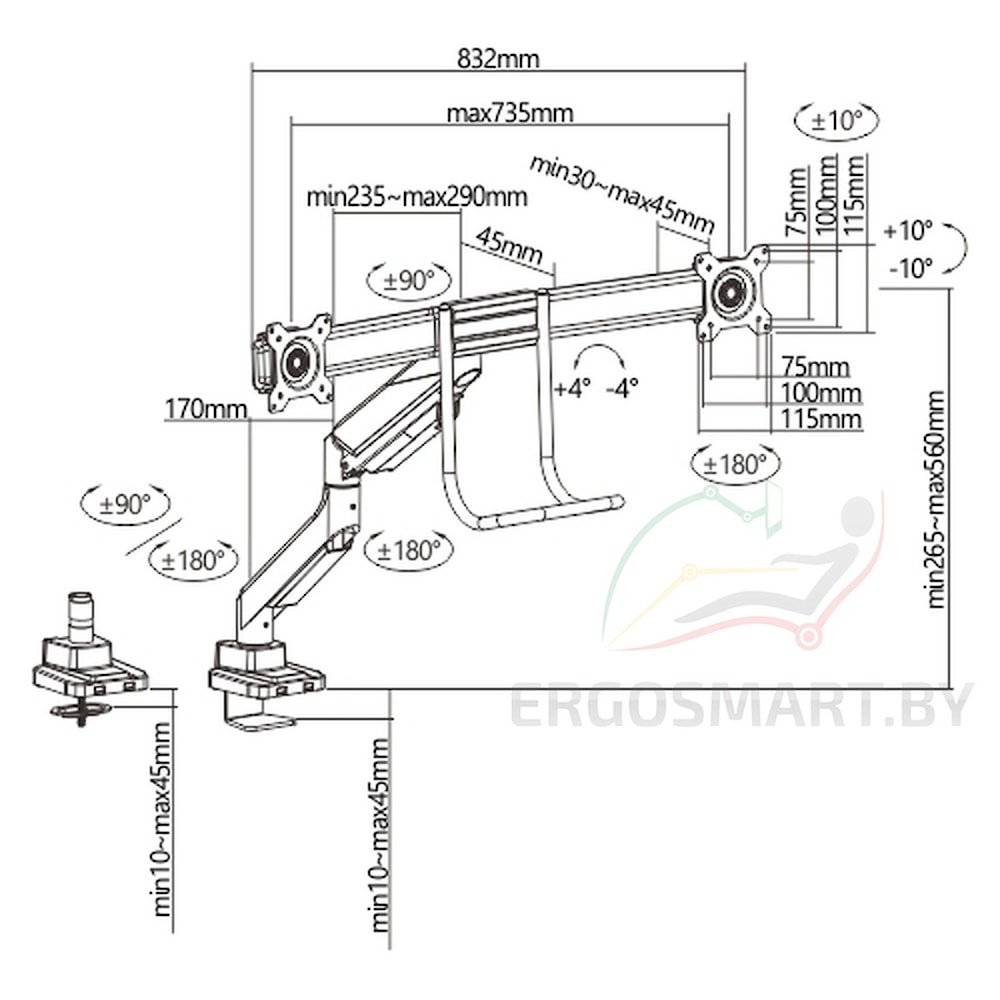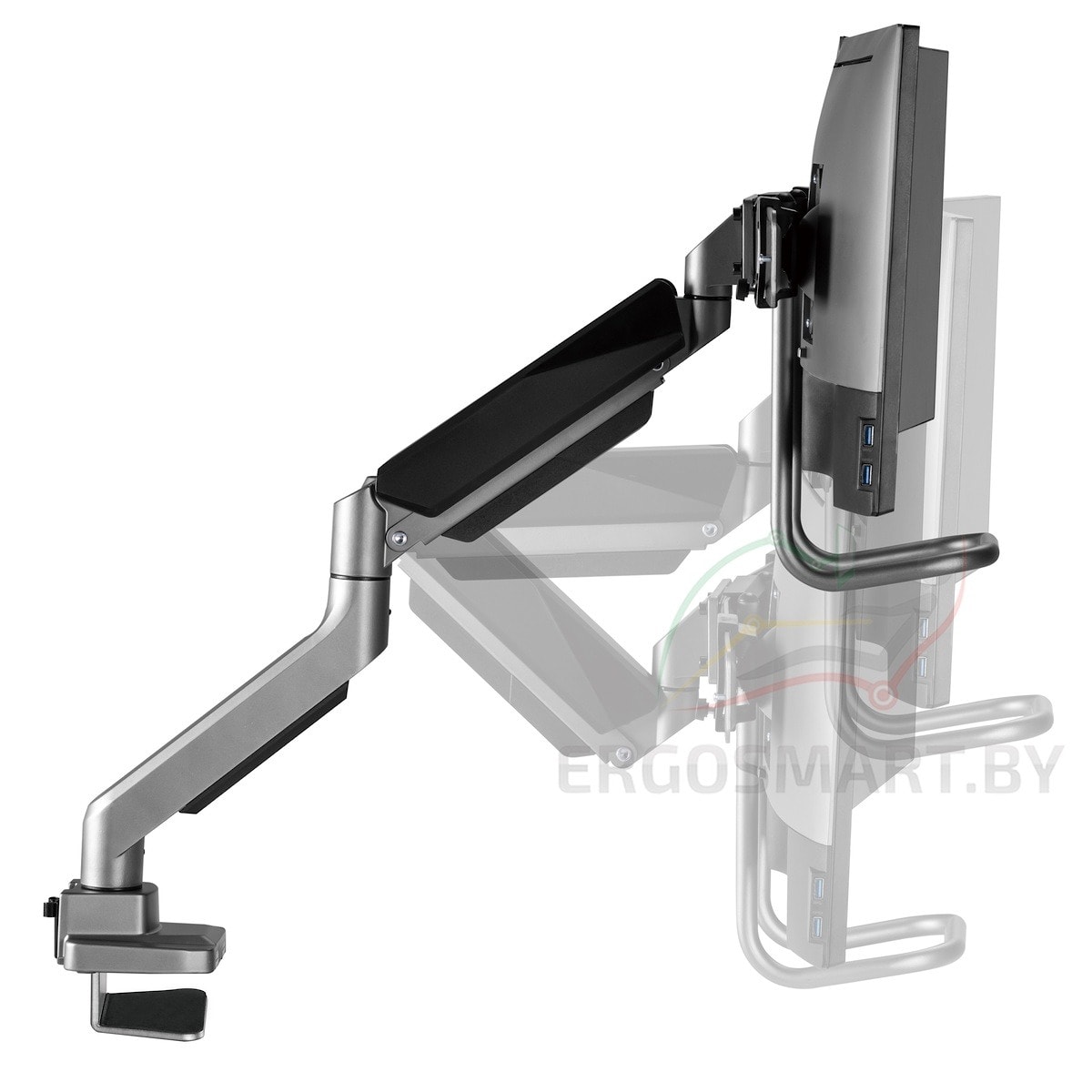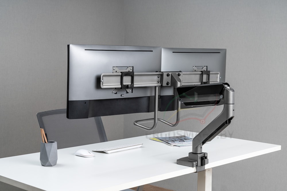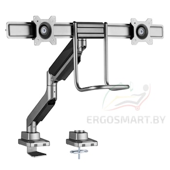 Механизм регулировки - газовая пружина премиум уровня. Держатель подходит для двух мониторов с диагональю 17"-32" дюйма и весом до 9 кг, то есть суммарно одно крепление выдерживает нагрузку до 18 кг!