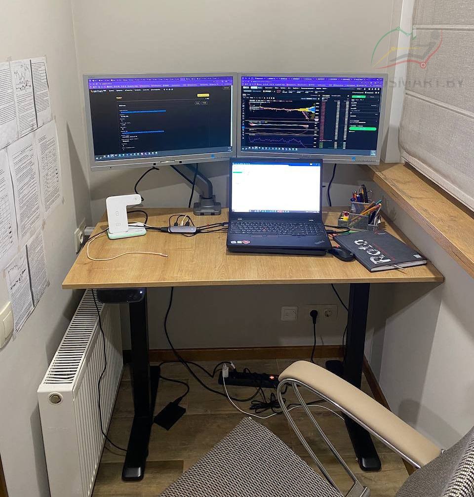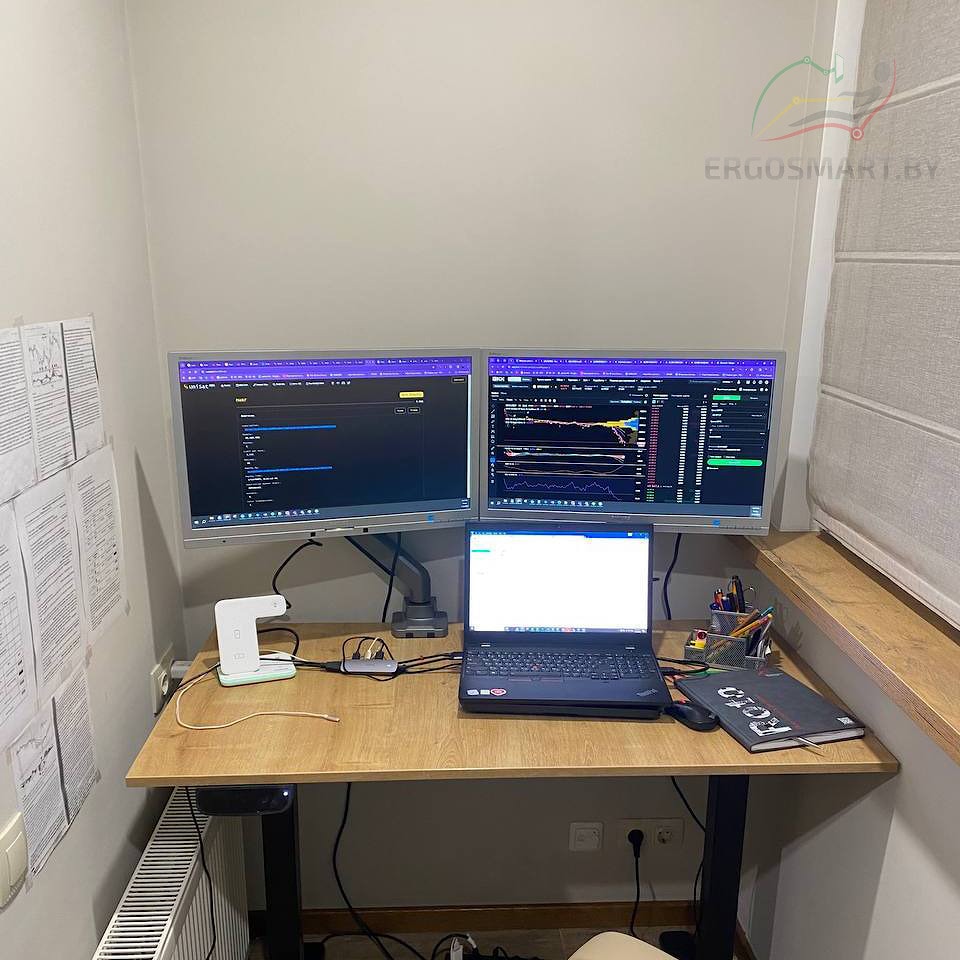 На фото кронштейн Heavy-Duty Combi с демонтированной ручкой, каждый монитор по 24 дюйма, столешница дуб натуральный 1200х650х18 мм на раме Electric Desk Prime.