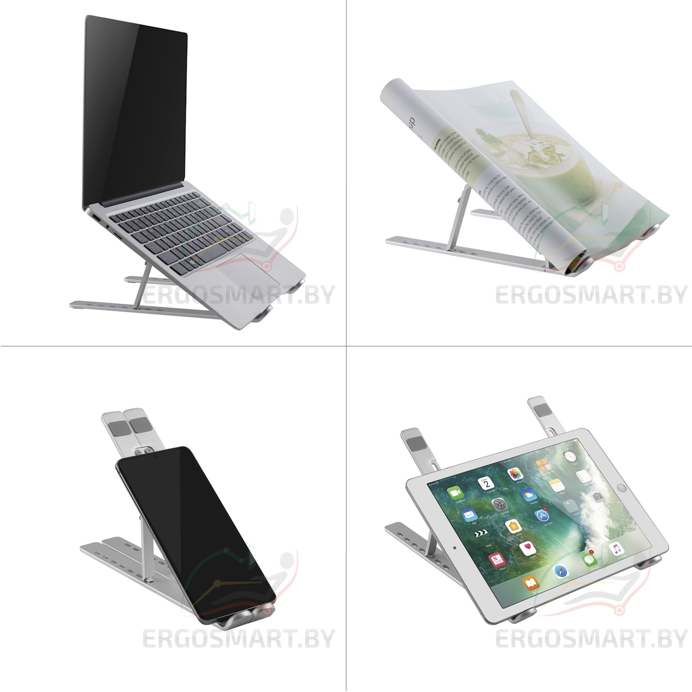 Эргономичная подставка Folding Evo также подходит для планшетов, телефонов, книг и журналов. Подставка мобильна, она складывается до размера 5х25 см, что очень удобно для использования в поездках.