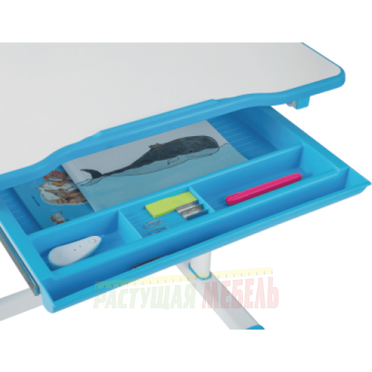 ![]() | Под партой размещен вместительный пенал с дополнительными делениями для канцелярских принадлежностей. У края столешницы расположен барьер против скольжения. |