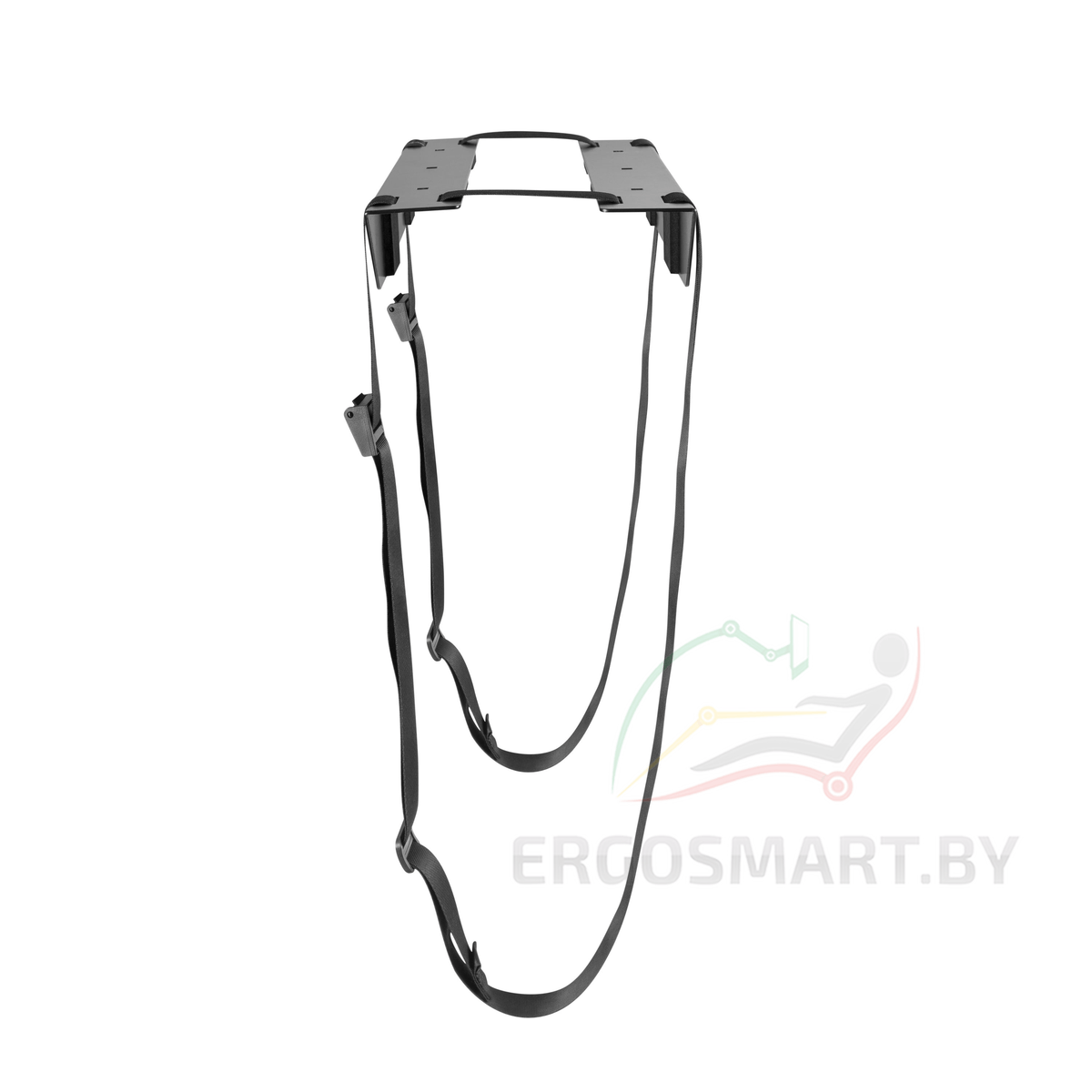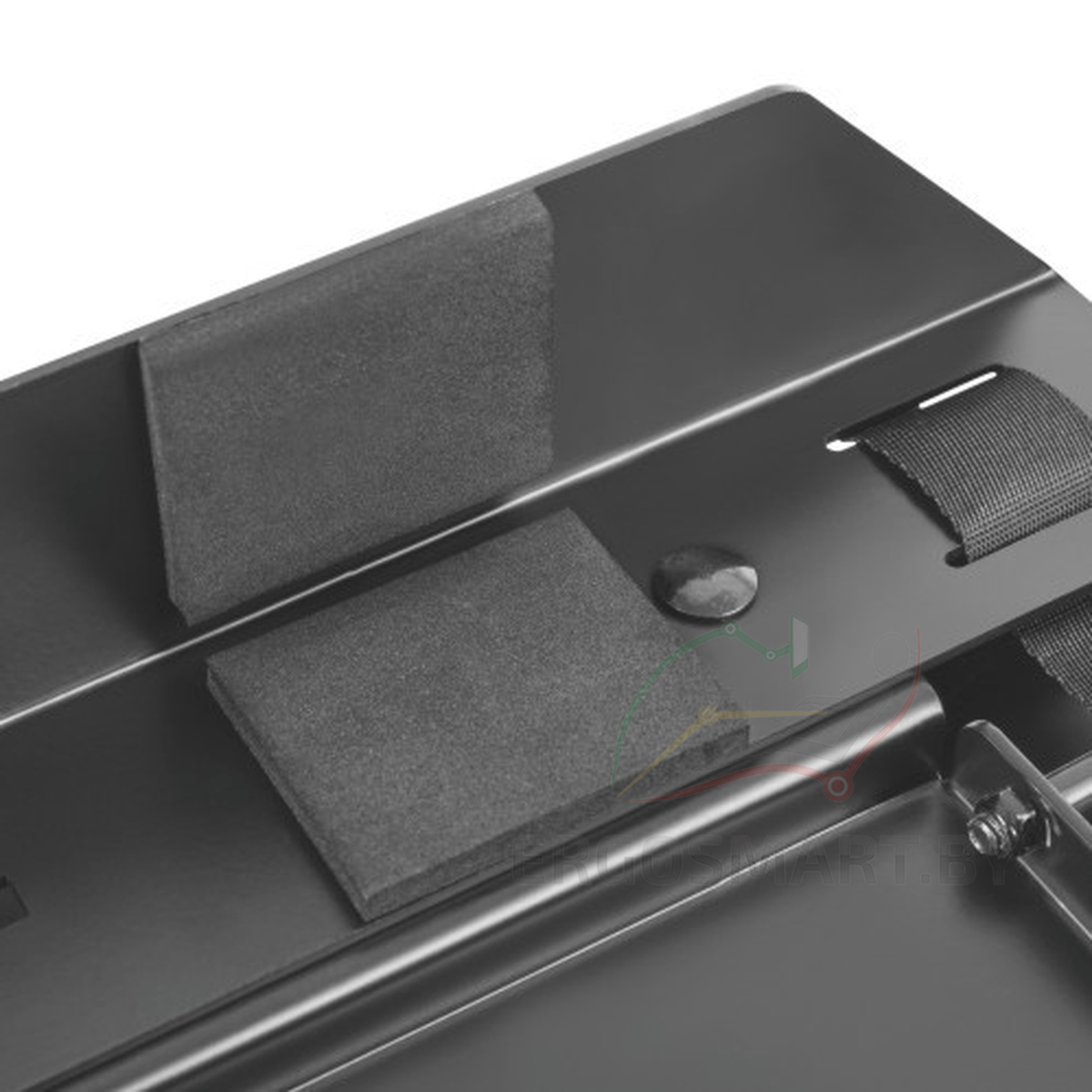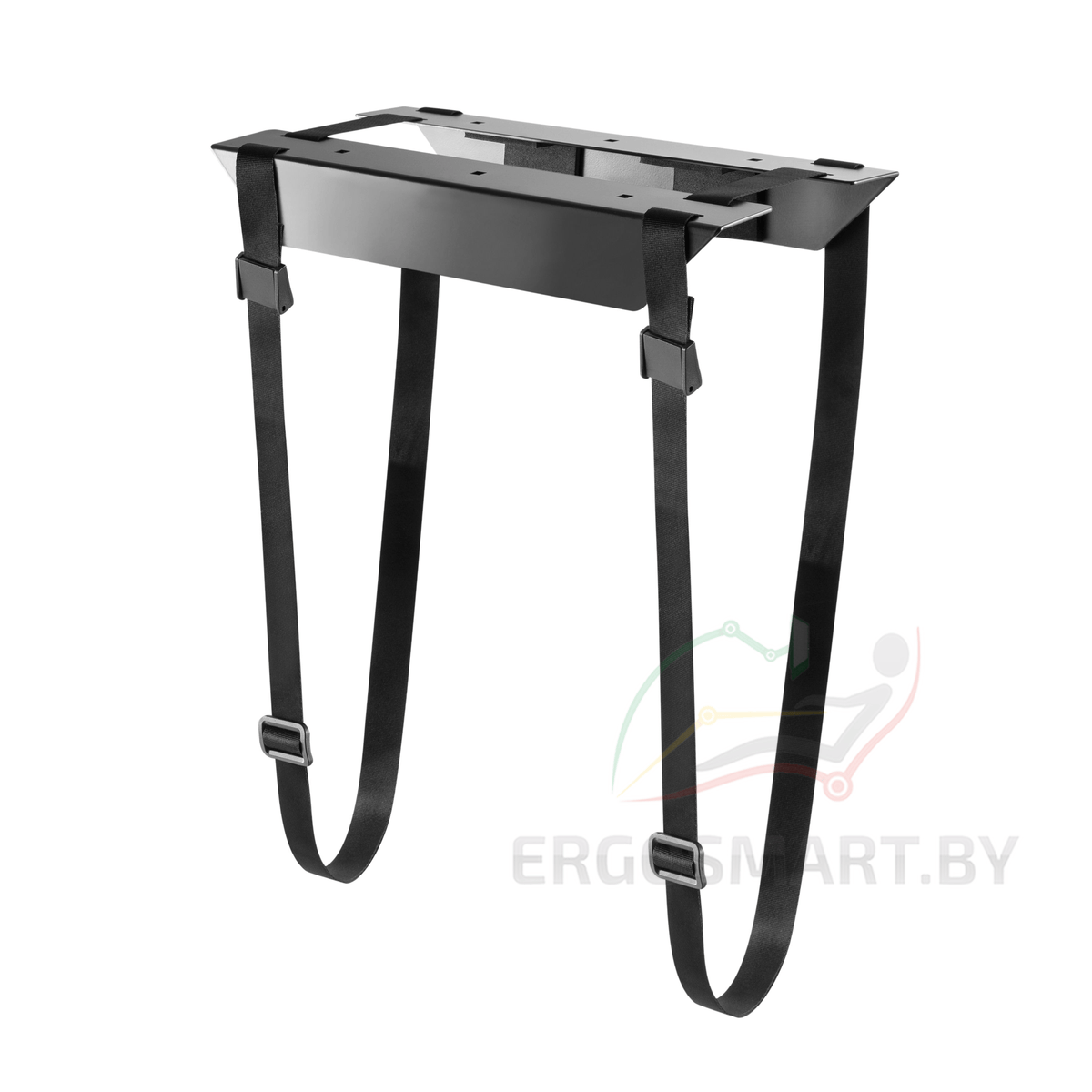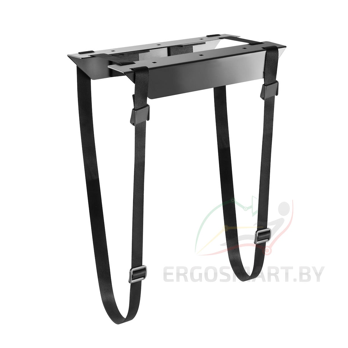 Кронштейн для компьютера представлен - 2 металлическими основаниями, которые крепятся к столешнице, и 2 регулируемыми ремнями, надежно фиксирующими системный блок.