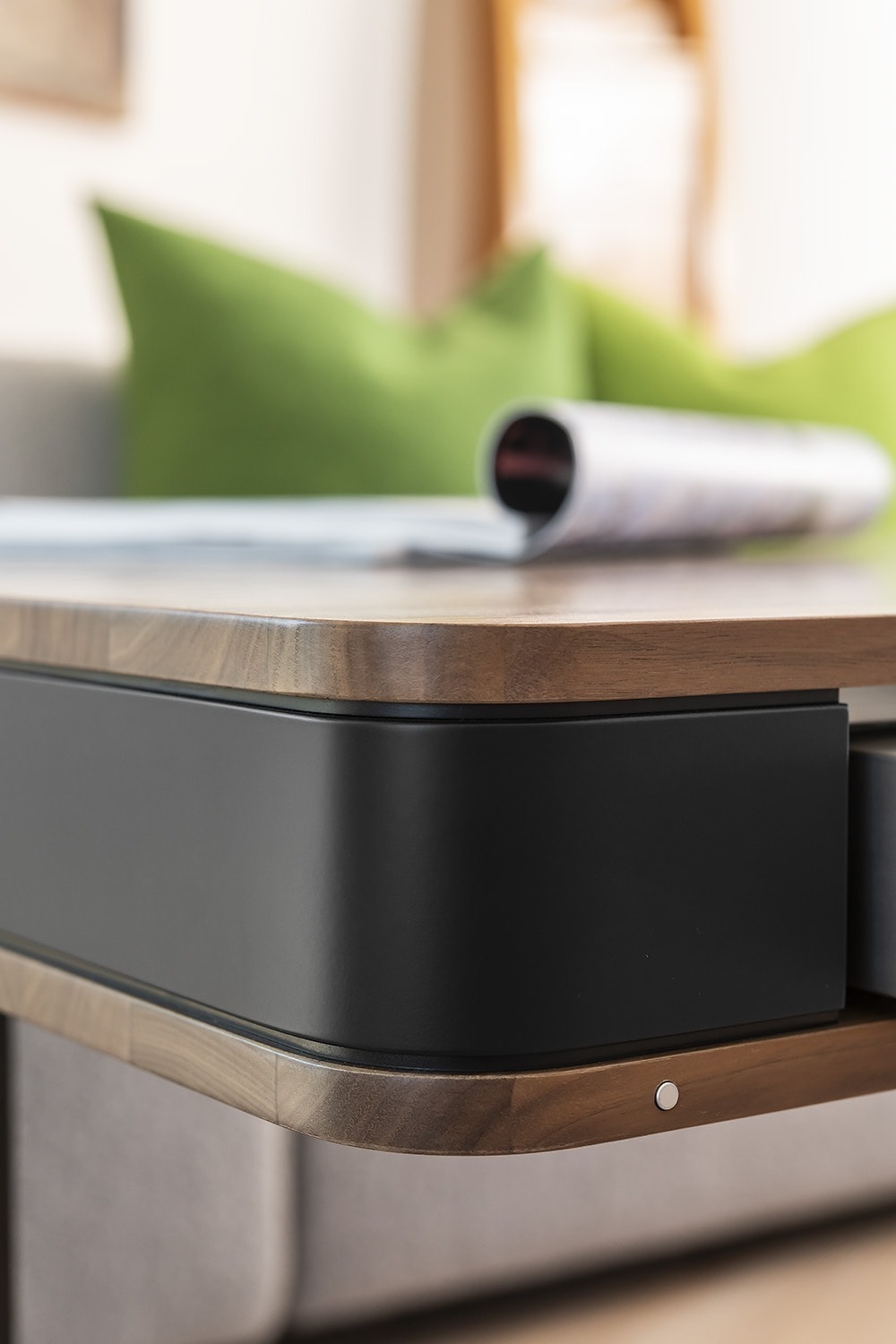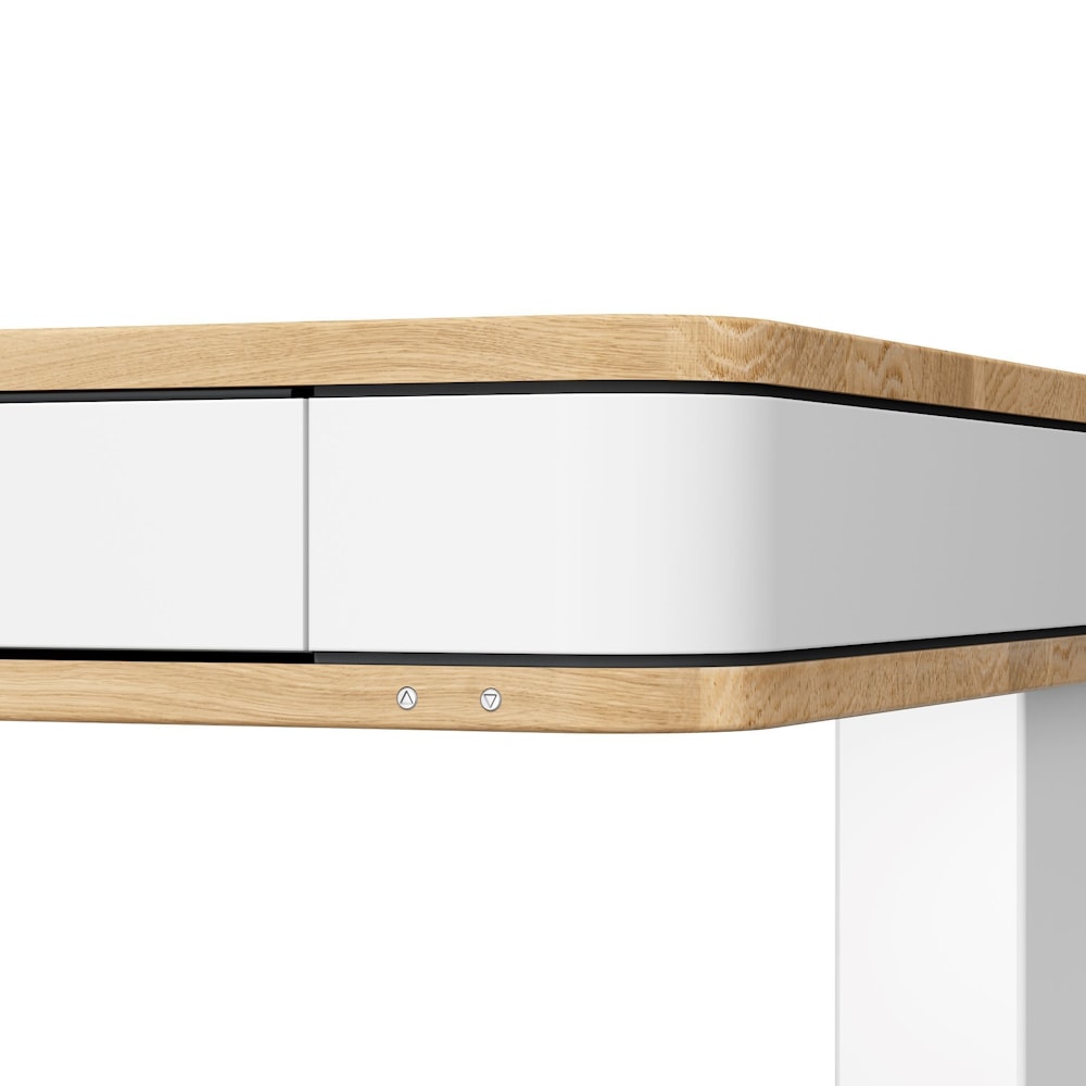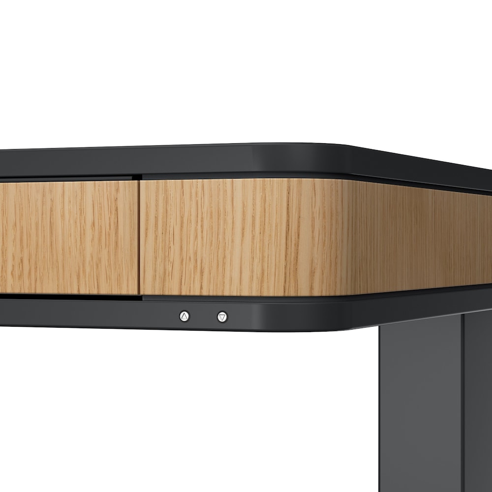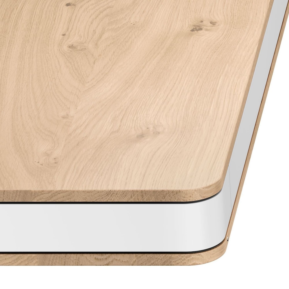 Столешница c "бесследной" поверхностью Soft-touchне оставляет отпечатков пальцев и отражает тепло. Боковая отделка из формованной древесины в декорах дуб, грецкий орех или в белом или в черном лаке. | Столешница из натурального шпона в оптике массивной древесины покрыта для износостойкости УФ-лаком. Боковая отделка из формованной древесины, покрытой белым или черным лаками. |