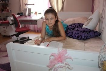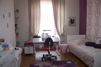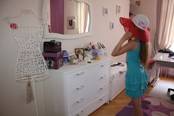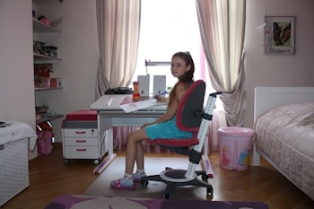 Лиза успешно занимается в школе - мы поздравляем ее с поступлением в гимназию! Она увлекается гимнастикой, танцами, очень любит животных (особенно лошадей). Интерьер ее комнаты выполнен в нежных розово-белых тонах. Комната просторная и светлая. Кровать, комод и корпусный шкаф немецкого производства фирмы Nolte органично сочетаются с комплектом мебели Moll, состоящим из стола Champion Front Up, настольной лампы Mobilight, тумбы Medi с подушкой и стула Maximo. Вся мебель изготовлена из ДСП. Интерьер комнаты дополнен множеством красивых и полезных аксессуаров. Между тем комната остается просторной и свободной.