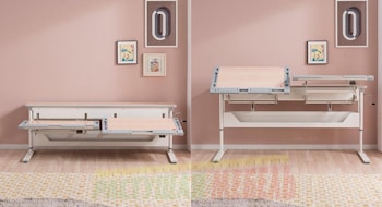 Механизмы стола, в том числе изменения угла наклона столешницы, снабжены ограничителями скорости. Это значит, что при регулировке высоты столешница не ударит с размаху по рукам малыша. Ящики в тумбах и столах с доводчиками, что также исключает случаи, когда ребенок ненароком зацепится за незакрытый ящик.